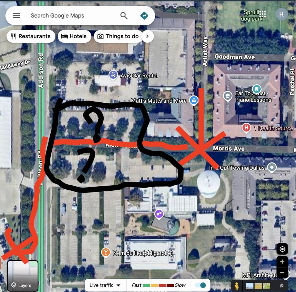 This is the layout of the area, as we can see there are two nice large parking lots in the immediate area. Why not initiate the stop there? Why follow me for so long before turning your lights on, if you had seen such a violation?