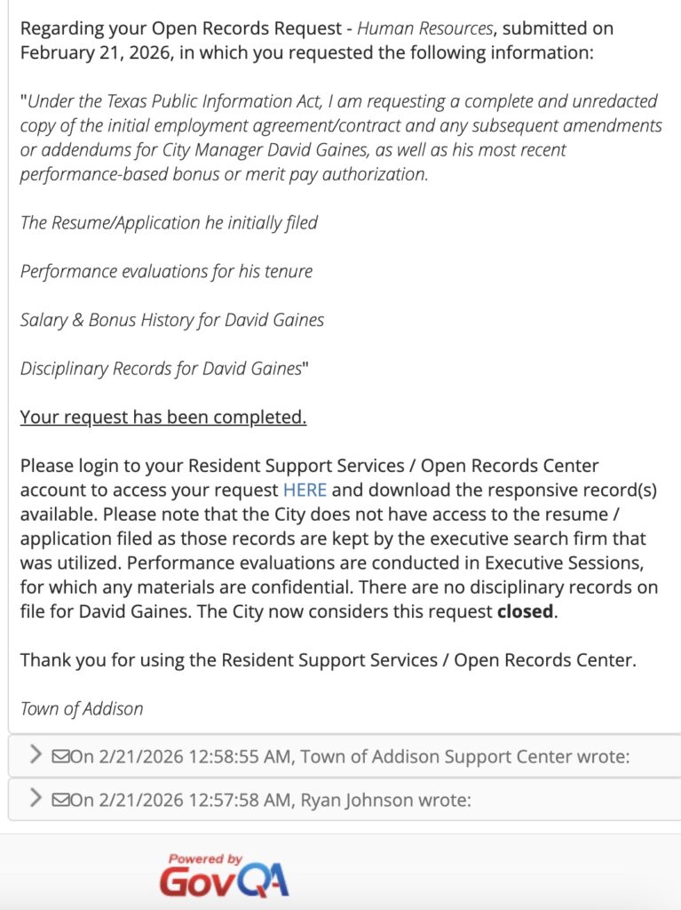 “In addition to my pending request, I am seeking the following specific records related to the FY 2022-2023 Budget Adoption (Ordinance 22-257):” The “Section 4” Ledger: Any list, spreadsheet, or ‘Working Paper’ compiled by Nicholas Vincent or David Gaines that identifies the ‘prior transfers’ or “encumbrances” ratified by Section 4 of Ordinance 22-257. The “Section 5” Ledger: Any list, spreadsheet, or ‘Working Paper’ compiled by Nicholas Vincent or David Gaines that identifies the ‘prior transfers’ ratified by Section 5 of Ordinance 22-257. Amortization & Issuance Records: All final Amortization Schedules for debt issued or refinanced in 2021-2022, including communications with Hilltop Securities regarding the ‘useful life’ vs. ‘debt term’ of these instruments. The “Solid Waste” Reconcile: Any email between Nicholas Vincent and David Gaines containing the terms “Fund 600” or “Enterprise Transfer” dated between Sept 1, 2022, and Oct 1, 2022. Journal Entry J22-XXXX: All ‘Journal Entries’ (JEs) that moved more than $100,000 out of the Solid Waste Fund or Water Fund during the month of September 2022. Separation Documents: The Separation Agreement and any ‘Release of Liability’ signed by David Gaines upon his departure from the City of Denton. Any emails to or from Gaines or Vincent to or from J.P Morgan, Hilltop Securities referencing “Debt Smoothing” or “Extending the Maturity.” “Pursuant to the Texas Public Information Act, I am requesting the following specific records related to the employment and departure of David Gaines and the financial oversight roles of Nicholas Vincent:” Gaines Personnel Records: The original Employment Application, Resume, and any “Letters of Recommendation” provided by the City of Denton for David Gaines. The Exit File: The final Separation Agreement, ‘Release of Claims’, ‘Resignation Letter’, and any ‘COBRA’ or ‘Severance’ payment records associated with David Gaines’ departure in 2022. Performance Audits: Any ‘Performance Evaluations’ or ‘Memorandums of Counseling’ for David Gaines and Nicholas Vincent between Jan 1, 2021, and the present. The Bond “Roadmap”: All Amortization Schedules for debt issued under the direction of David Gaines (specifically Certificates of Obligation and General Obligation Bonds) from 2020-2022. Garbage Contracts: Copies of the current contracts and all ‘Administrative Directives’ related to North Texas Waste and Dallas Metal Recyclers.