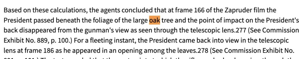 The Warren Commission’s own report mentions Oswald had to “shoot through a gap” in the tree. Look at this footage. There is no gap. There has never been a gap.