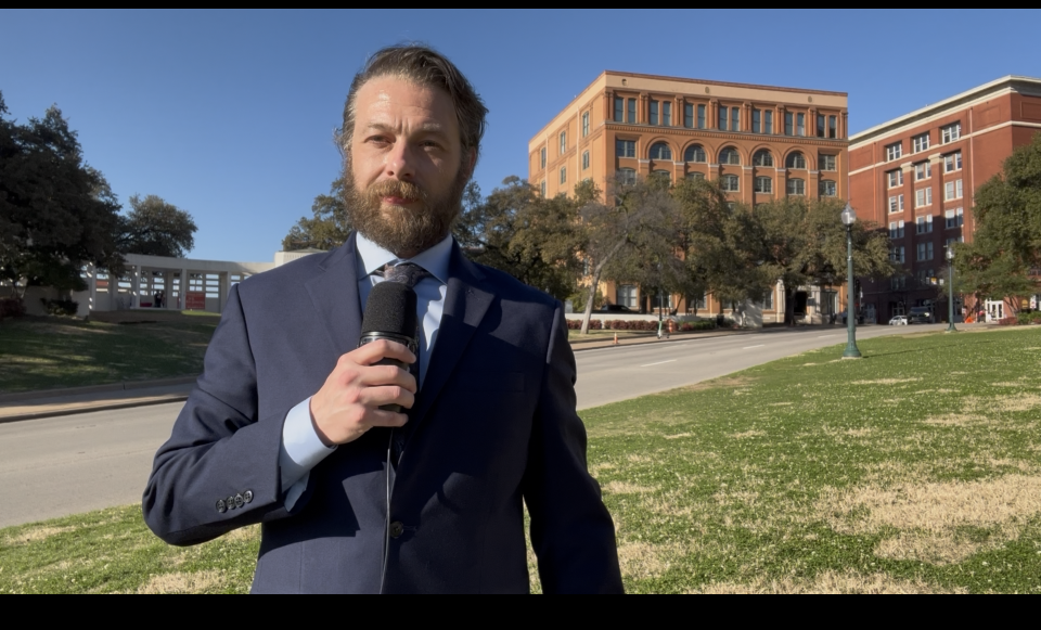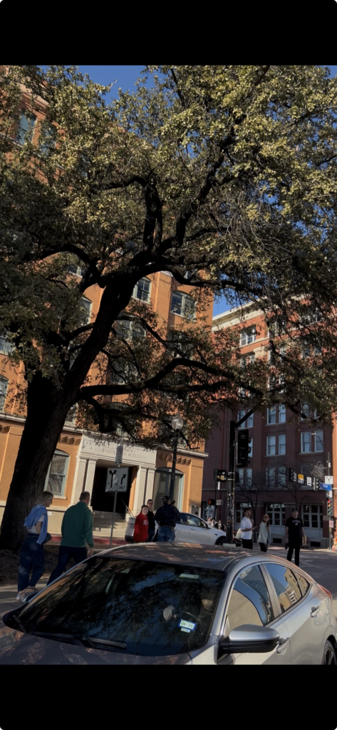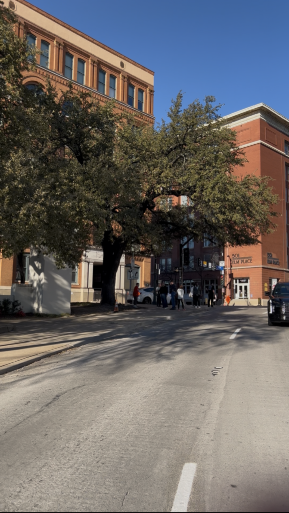 I walked the parade route on February 16, 2026. Looking up from the fatal “X” to the 6th floor window, the line of sight is zero. The Texas School Book Depository is a ghost behind the leaves.